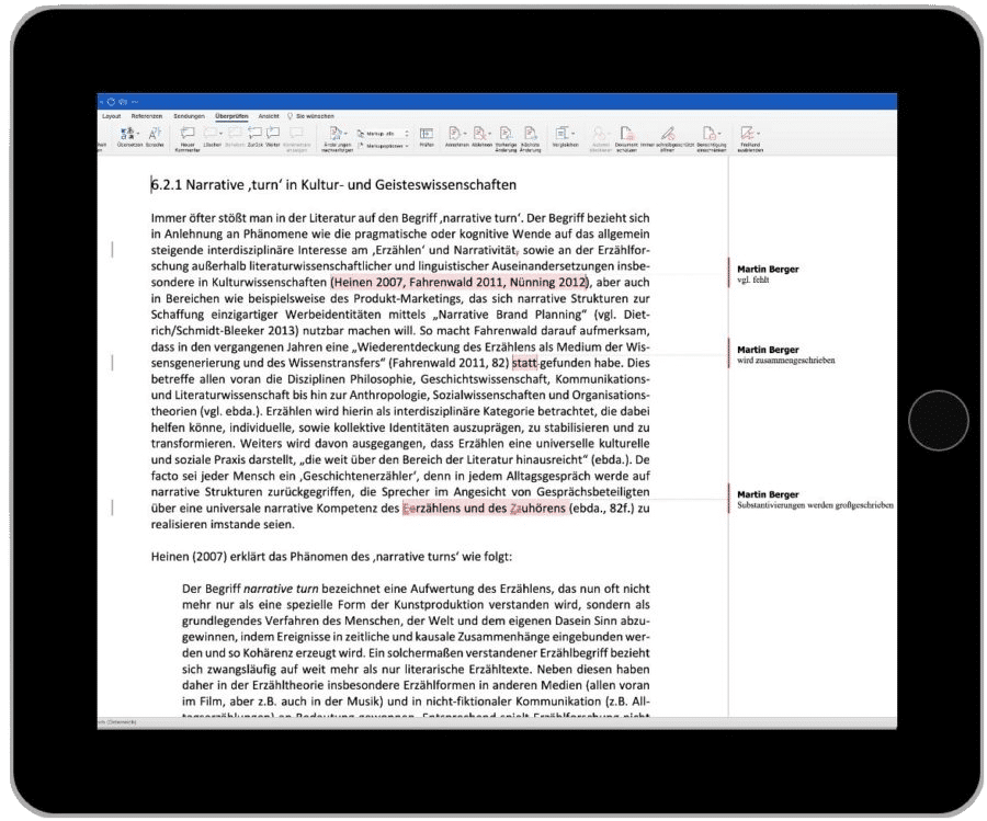 Wenn deine Arbeit in MS-Word erstellt ist, werden Korrekturen direkt im Dokument vermerkt und können jederzeit nachverfolgt werden. Das heißt natürlich auch, dass du keine Änderungen annehmen musst, mit denen du nicht einverstanden bist. Außerdem gebe ich Hinweise und Erklärungen in Form von Kommentaren, die dir zum Teil auch als Denkanstöße dienen sollen – wenn in deinem Text zum Beispiel wichtige Elemente einer wissenschaftlichen Arbeit fehlen oder die Arbeitsmethodik fehlerhaft erscheint.